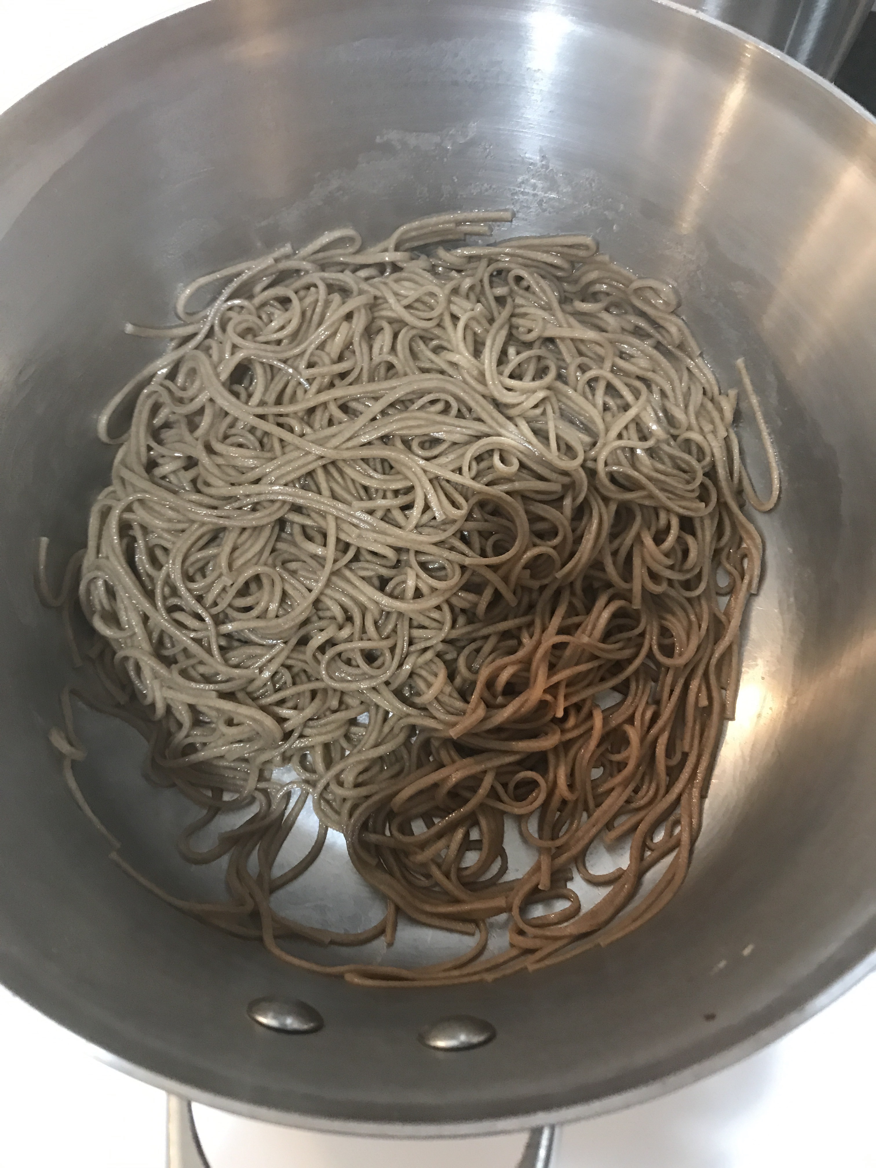 When your noodles are done, add a dash of sesame oil to keep them from sticking and let them cool for a moment.