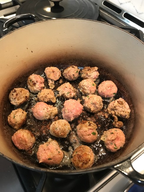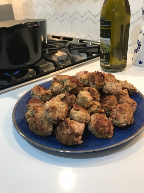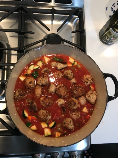 Turkey Meatball recipe here – The only changes I made to this recipes is that I rolled them smaller and sauteed them in a little bit of olive oil. I recommend doing them in batches so there’s room for you to move them around. They are very delicate until you start to brown them. I also used 2 lbs of meat and increased the recipe over all to make extra for leftovers but you can keep it the same.