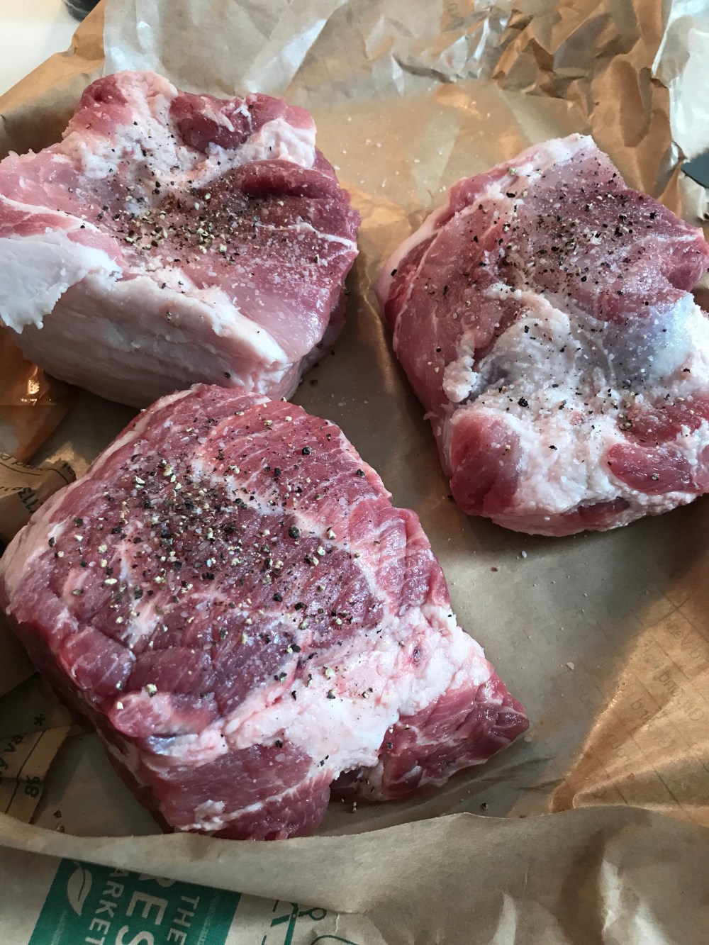Cut your pork into 3 manageable sized pieces, pat dry and season with salt and pepper. Turn pan on high and sear all sides of the pork. If your pan is too small do it in stages or you will steam your meat instead of sear it.