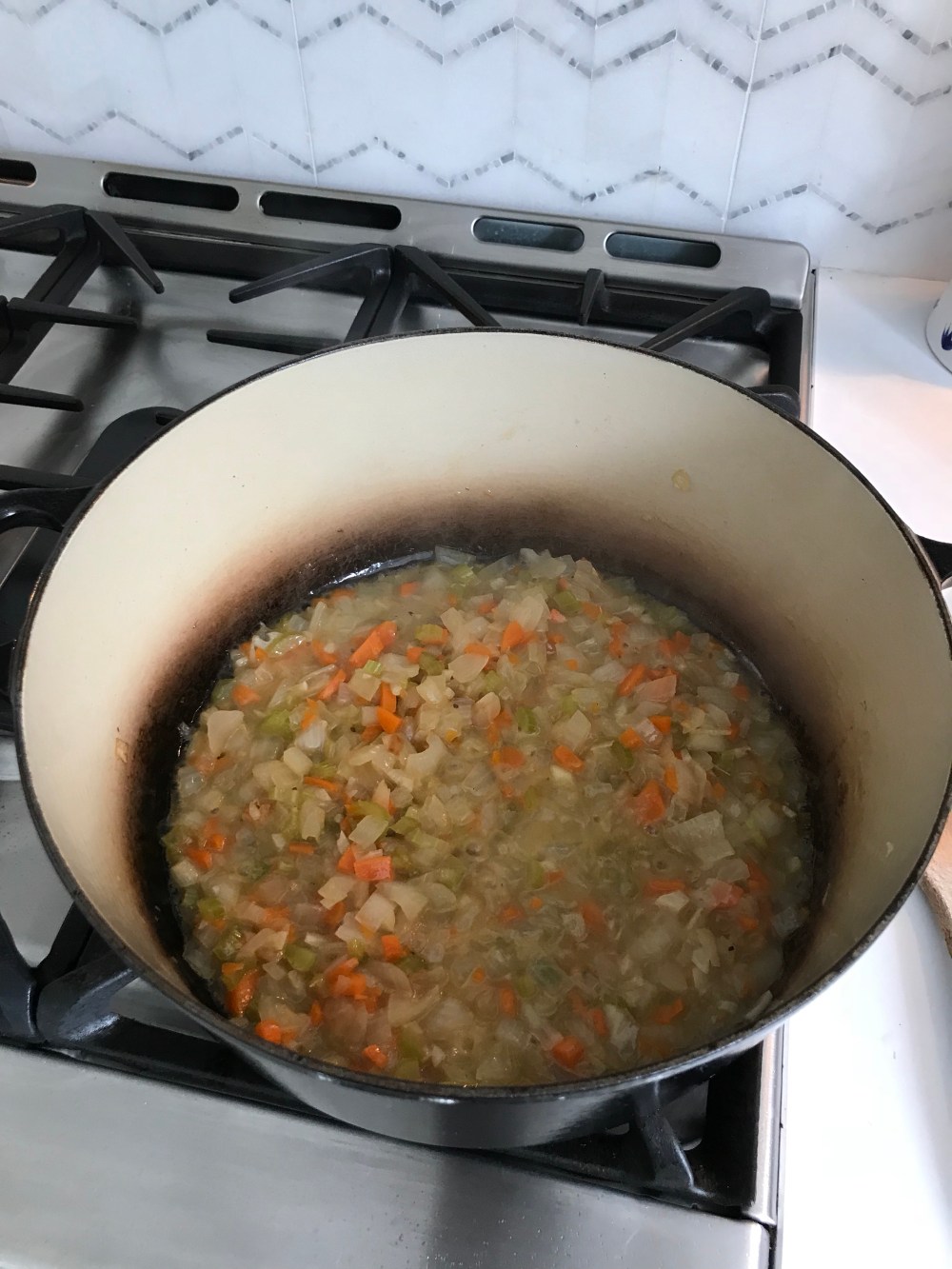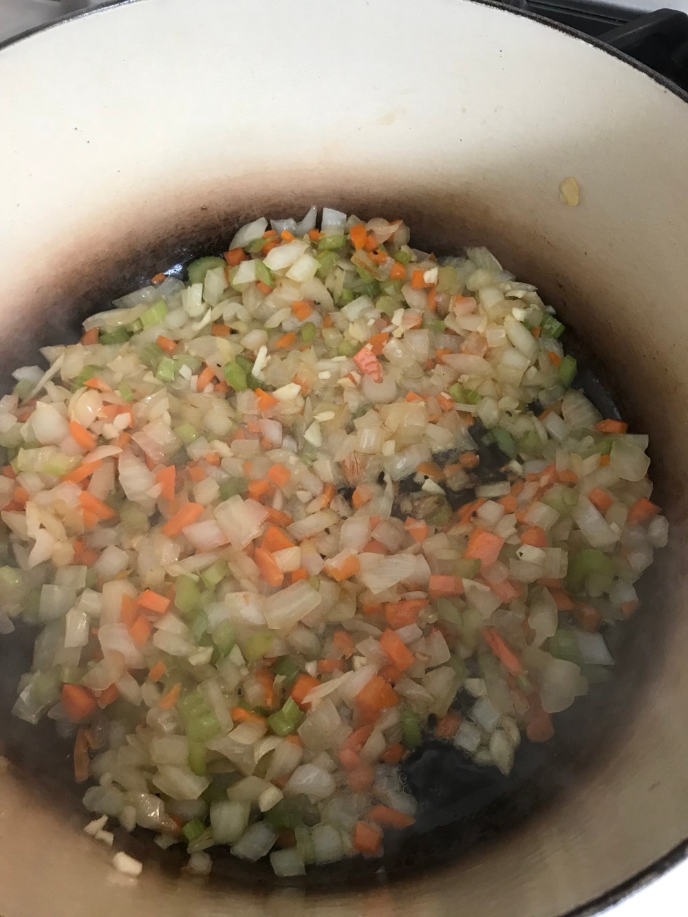 When your pork is done searing remove from the pan and add onions. (Add more oil if needed) Let cook for 2-3 minutes and then add carrots and celery. Let cook another 3-5 minutes and then add garlic and cook until you smell the garlic!