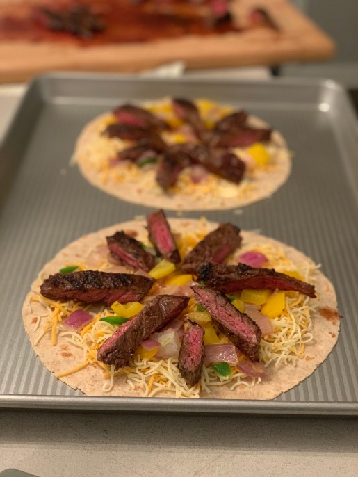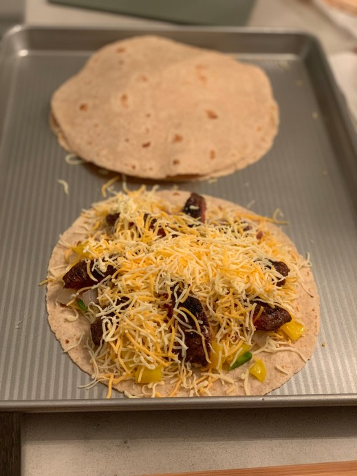 To assemble your quesadillas, first put a layer of cheese down, then your pepper and onion mixture. Then steak.