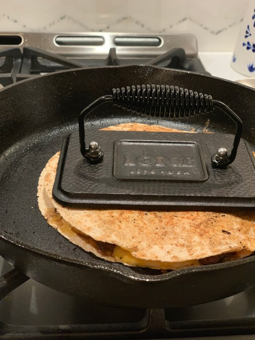Place in hot greased pan and use a press to make sure it gets nice and gooey/melty. Make sure you have a nice big spatula for flipping it over. It’s not easy but I promise you can do it- have faith.