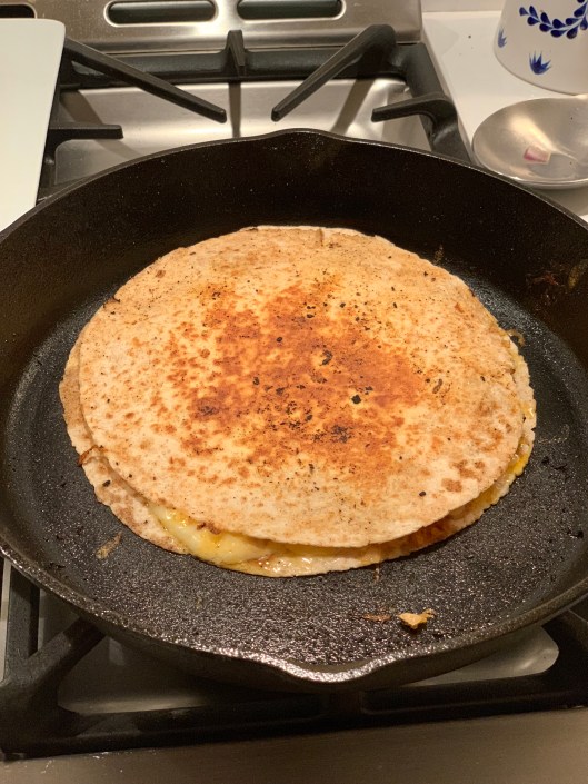 Mmmmmmmm. When we were little my mom would make us little quesadillas and wrap them in tin foil and then throw them in the toaster oven when we wanted to eat them. It’s a good snack to keep on hand if you make it in a smaller version or feed to a crowd on demand. Easy to make ahead!