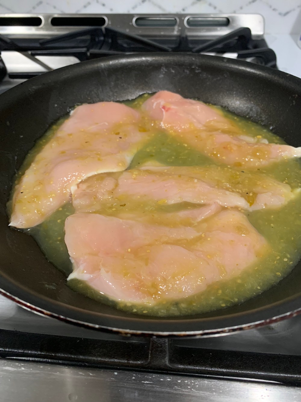 - Place chicken breasts in a pan with 1/3 of the salsa and let cook on low.
