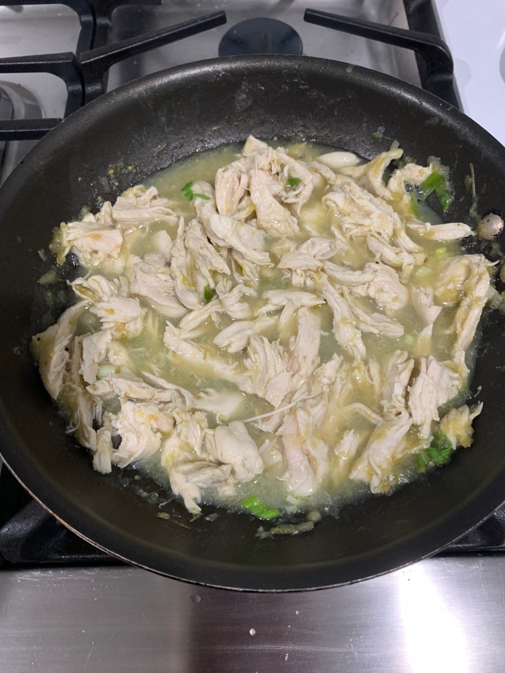 - Let simmer until mostly cooked. Use two forks to gently pull apart chicken.