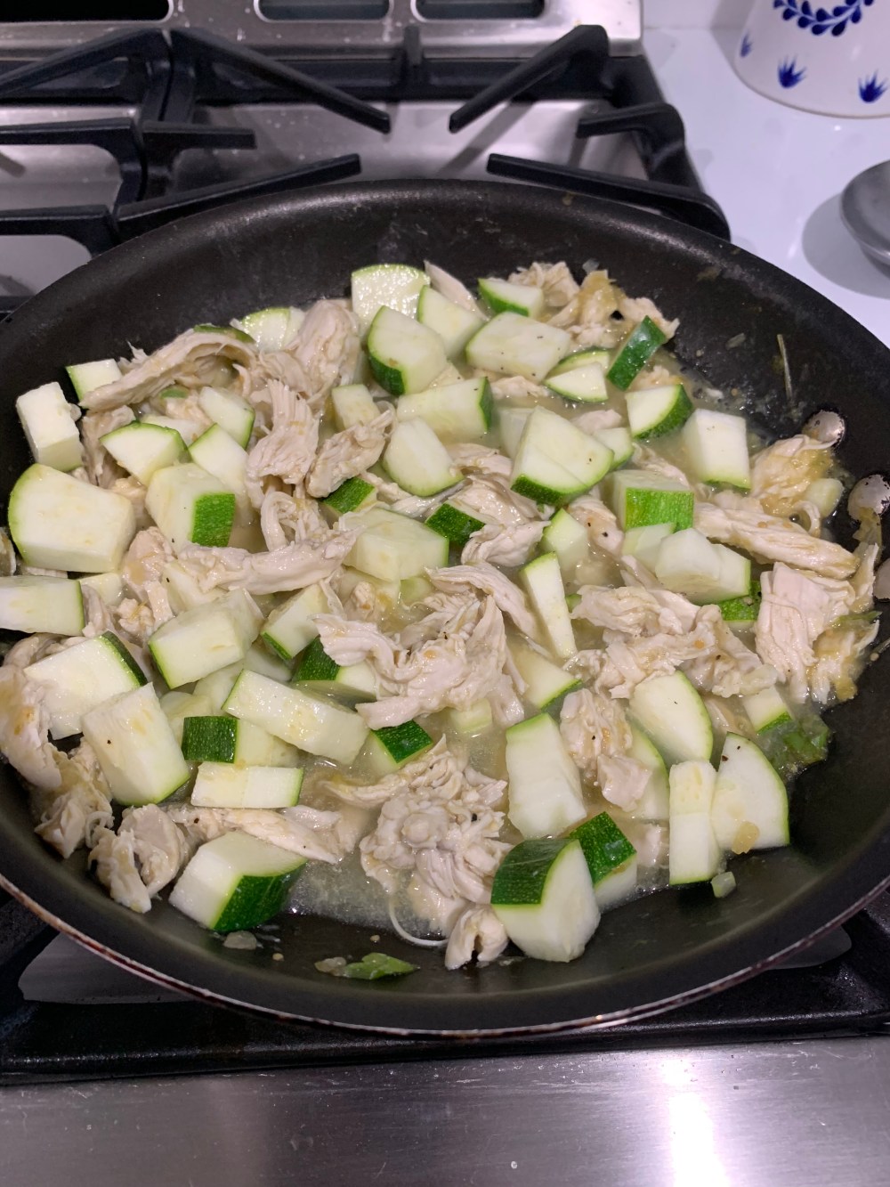 - Add zucchini and let simmer for a few minutes. Season with salt, pepper and garlic powder.
