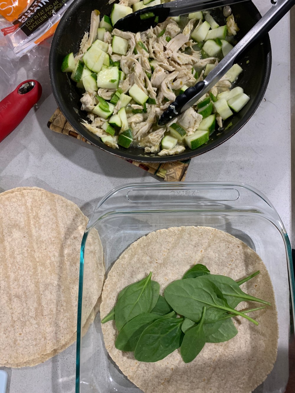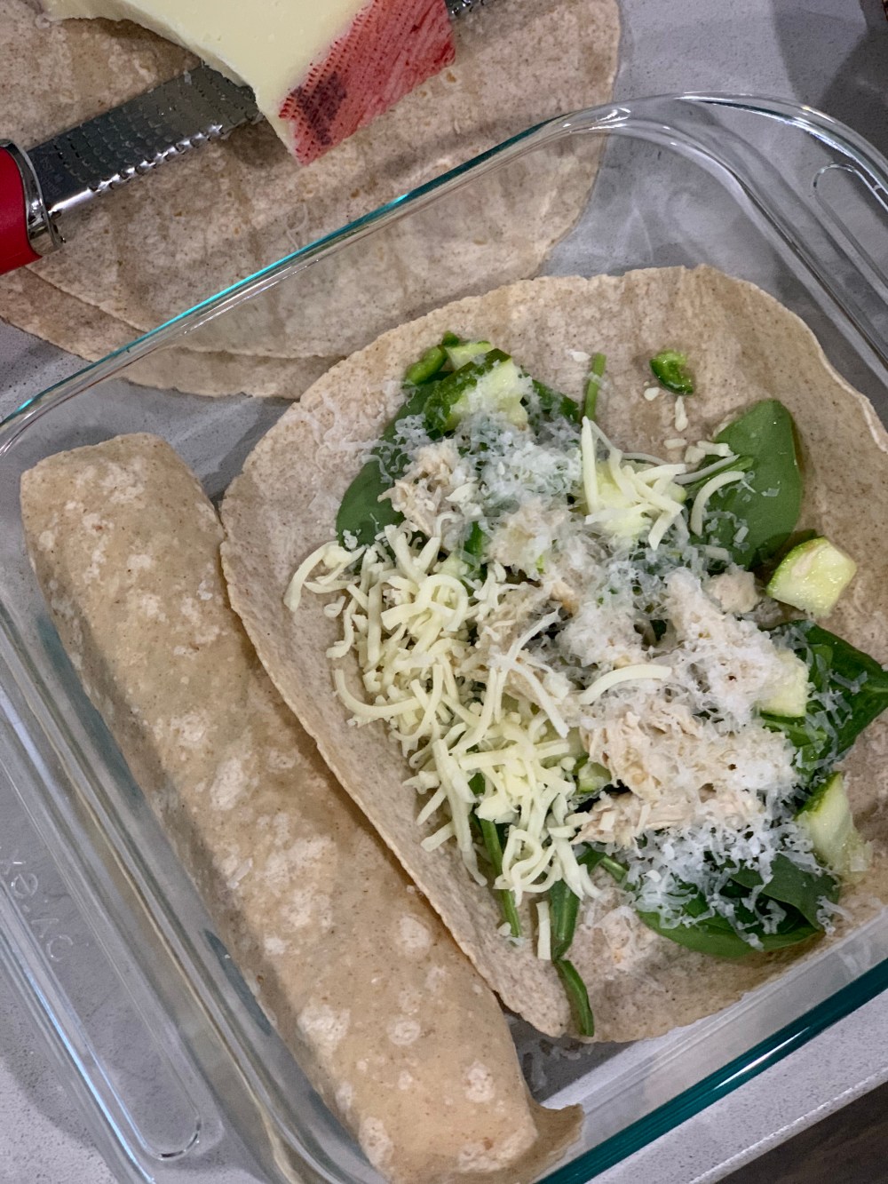 - Assemble the tortilla with spinach, chicken mixture and top with fresh grated manchego cheese.