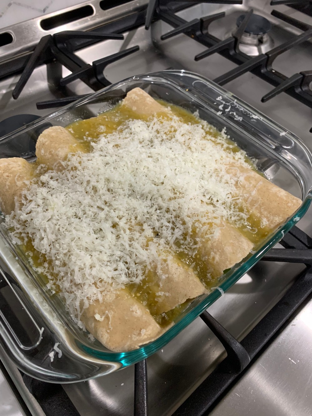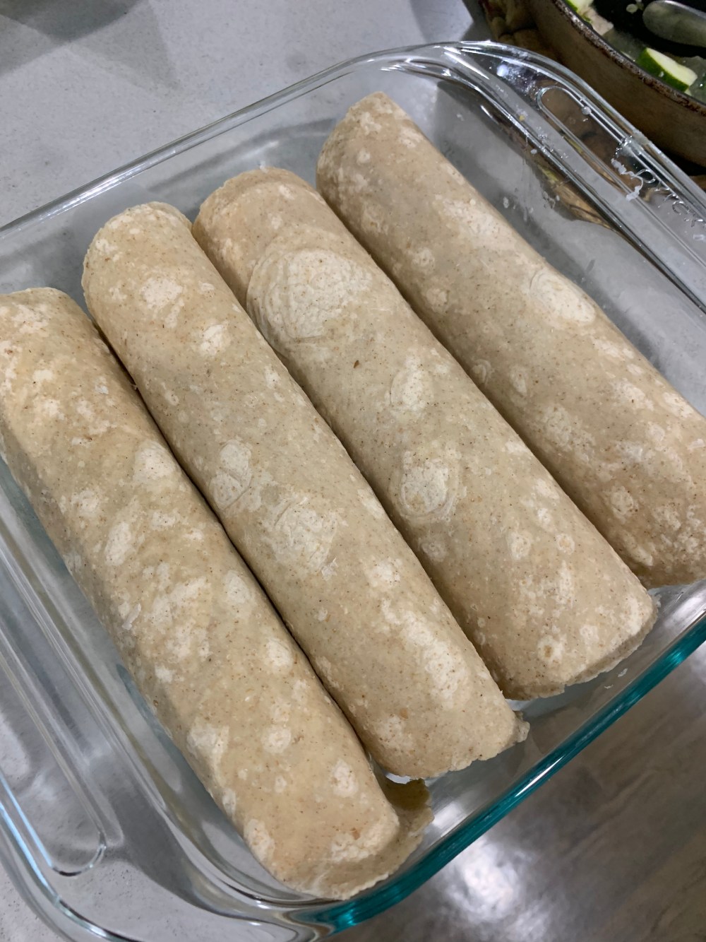 - Roll the tortilla up and place seem side down in a casserole dish. Repeat until you use up all your fillings.