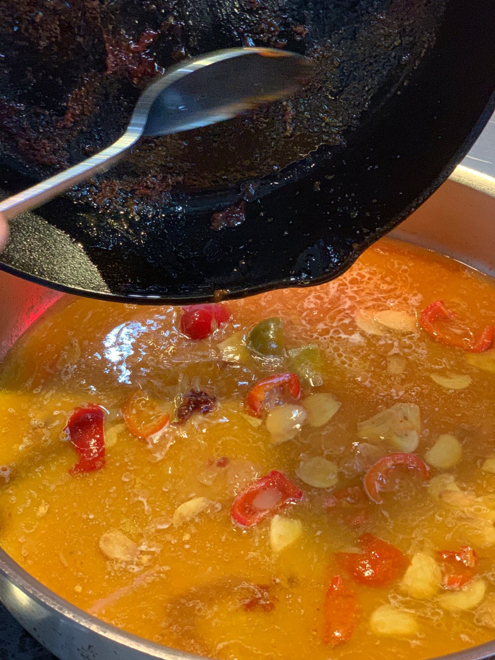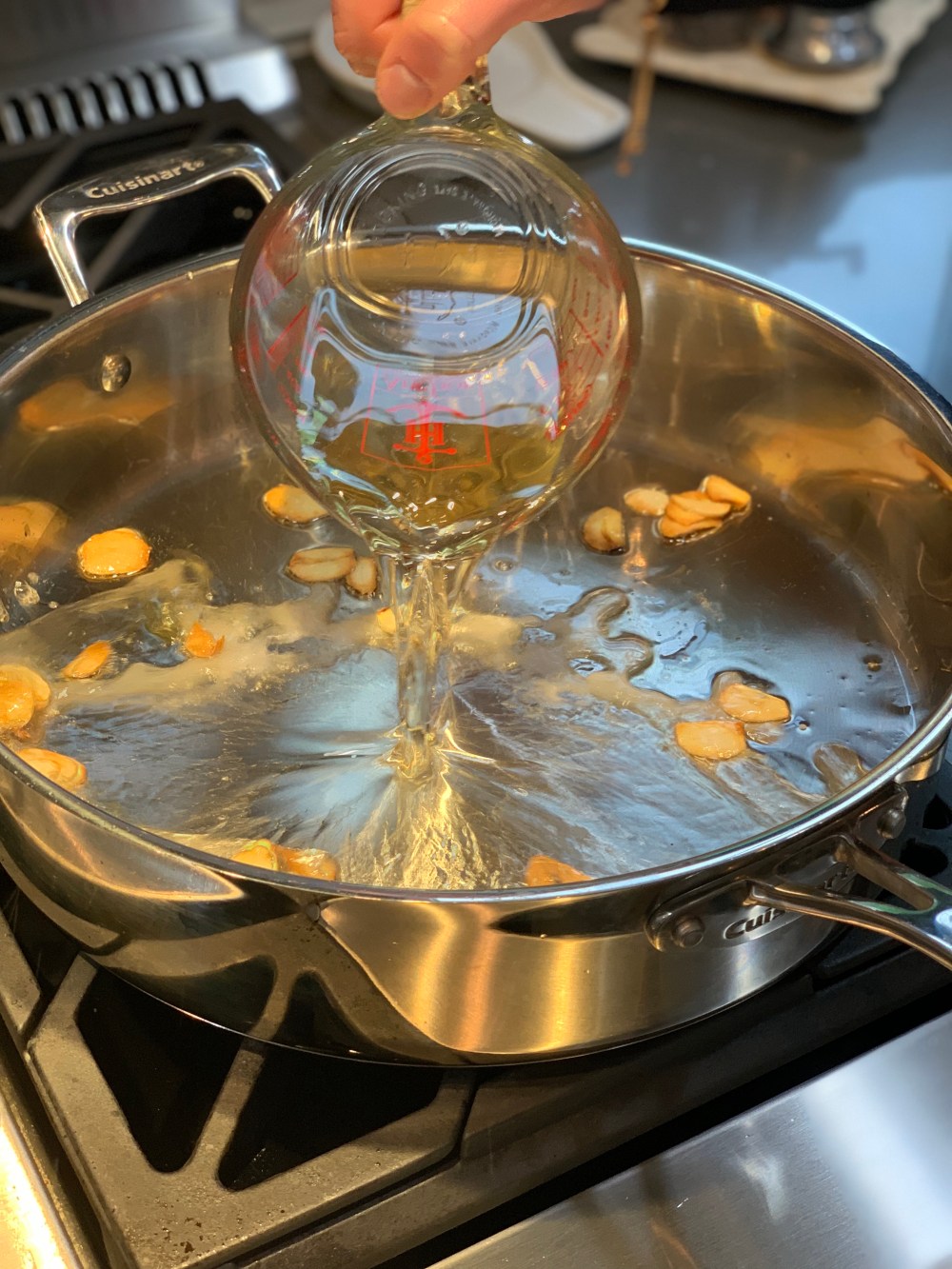 When the garlic is nice and brown add the white wine. Let the liquid come up to a simmer.