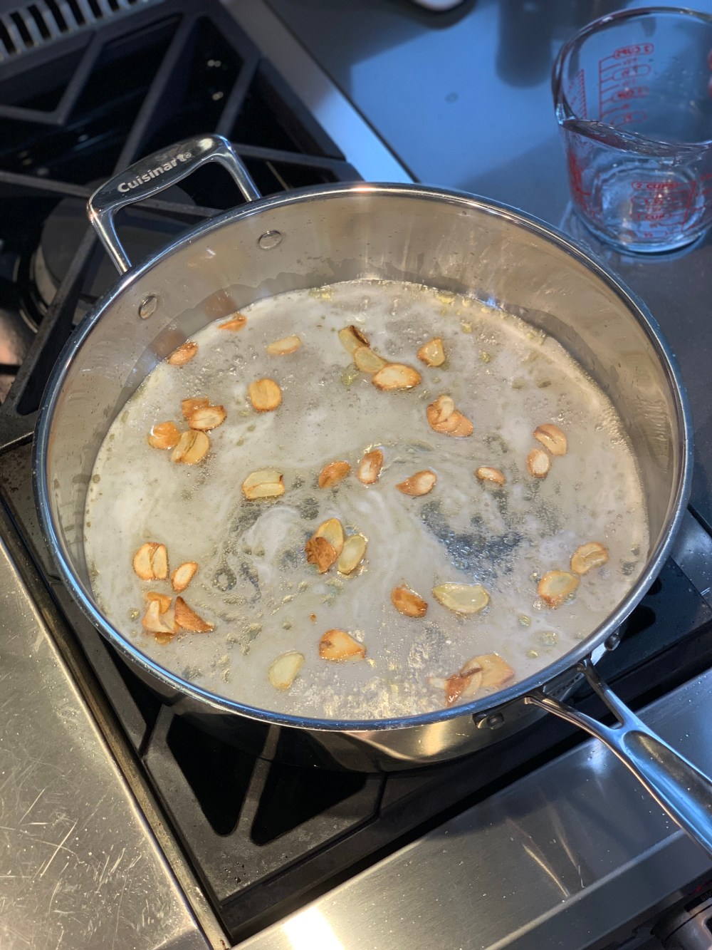 In the meantime while your chicken is in the oven, put a cold pan on the stove. Add in olive oil and garlic. Then turn on the heat and let the garlic brown. You should watch this step closely as there are milliseconds between beautiful browning and burnt disaster.