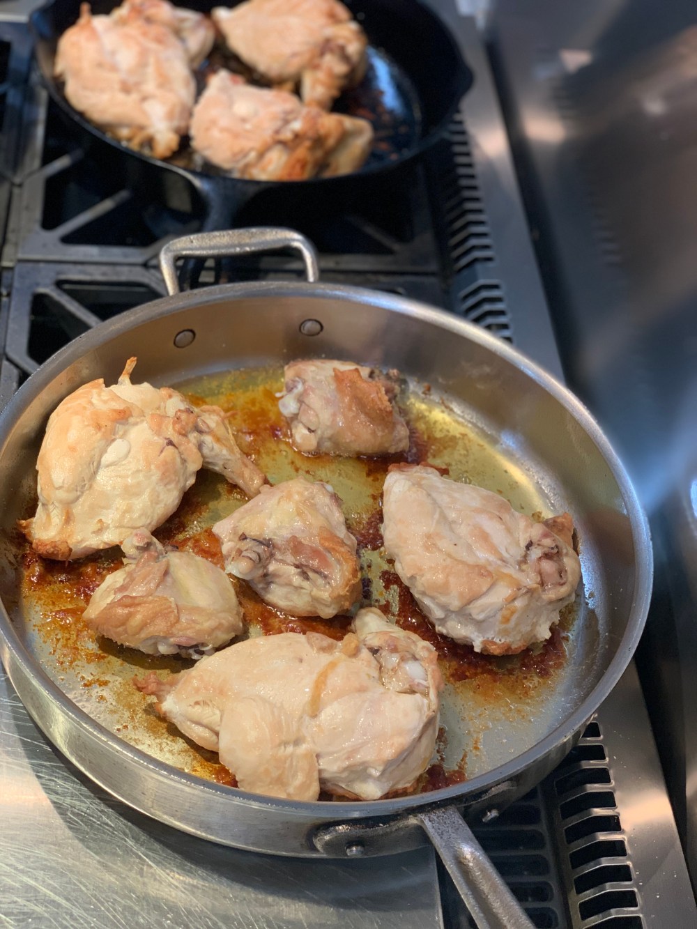 Get your oven safe pans very hot! When ready, add in about 10% olive oil to 90% vegetable oil–enough oil to just coat the bottom of the pan. Then add your chicken skin side down in the pan and try not to move it. Also be careful not to over crowd the pan as you want some serious searing going on – not steaming. We used two pans. Let it go for about 5/6 minutes.