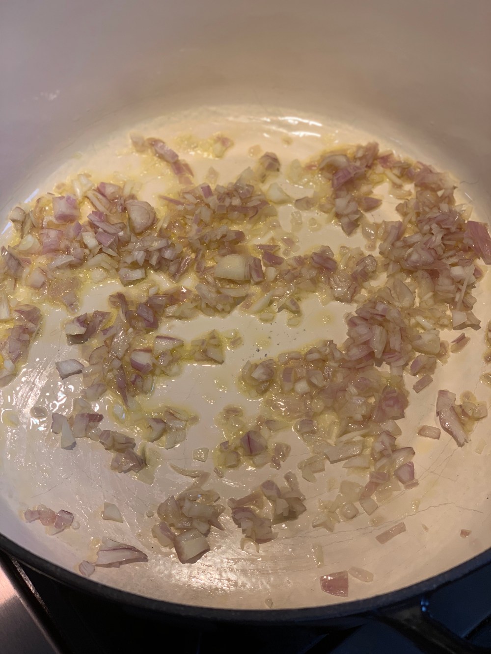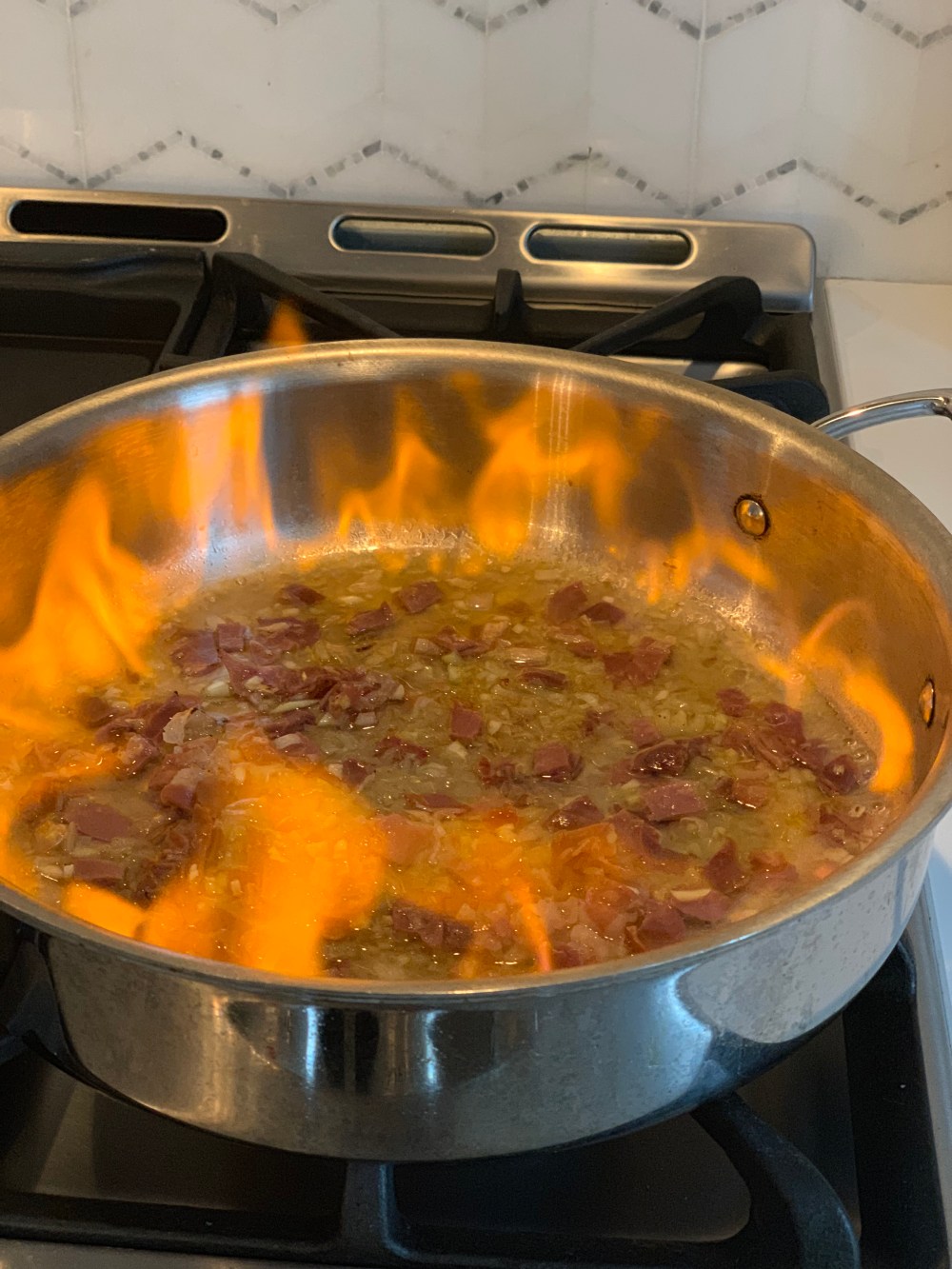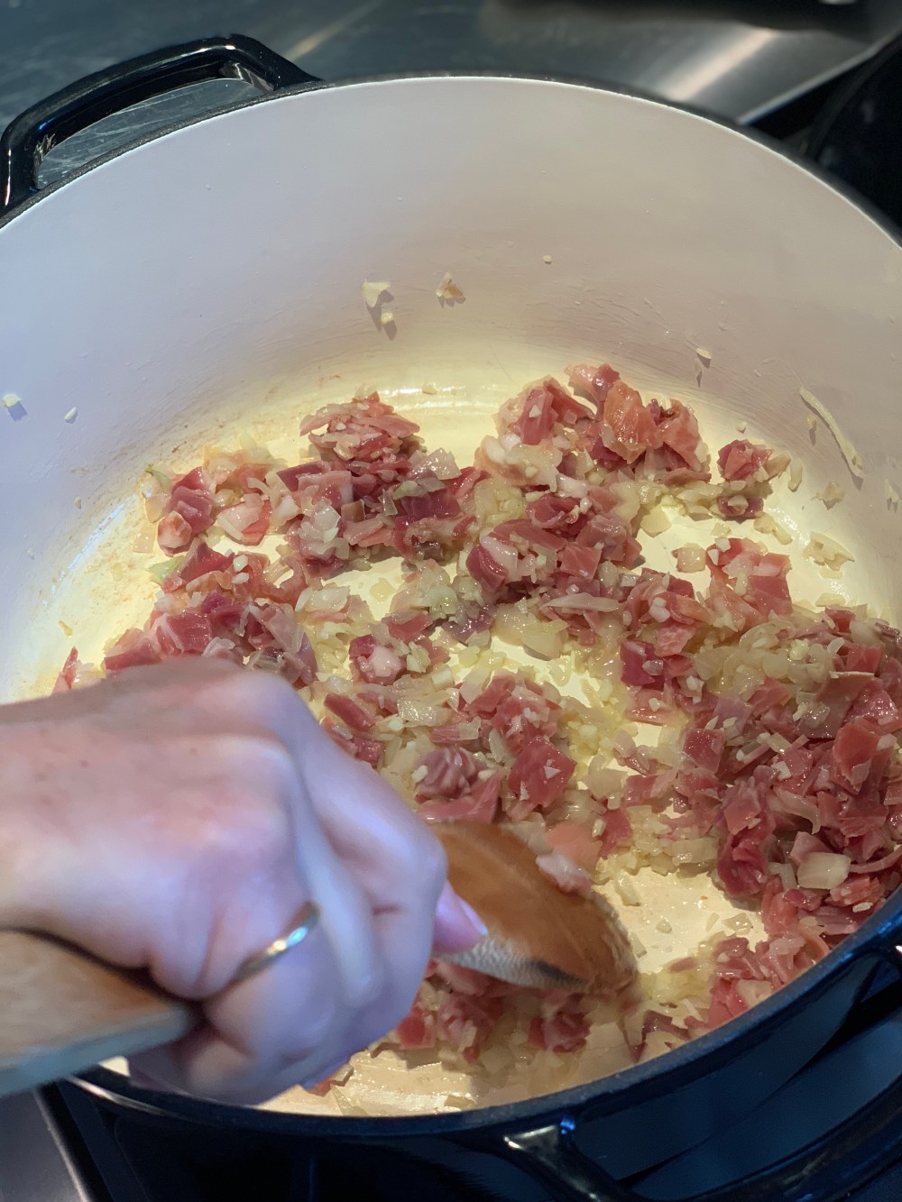 Add in prosciutto and let cook for a few minutes. This is also the time to add your red pepper flakes and capers. We forgot and added them later…
