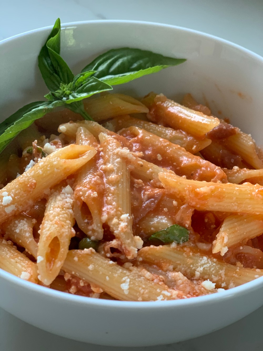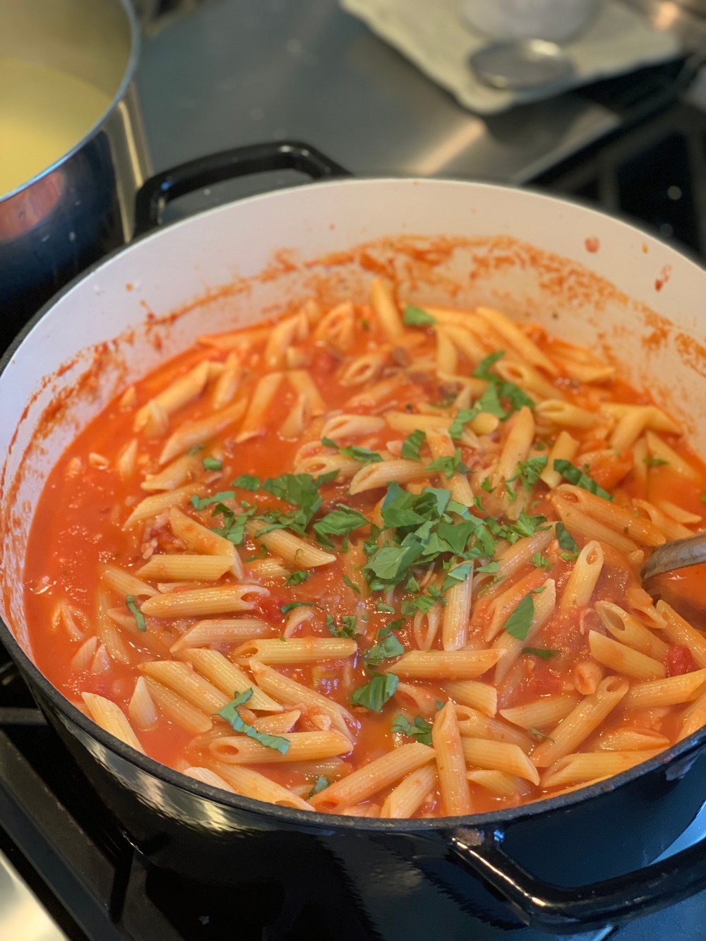 Add in your al dente penne to finish cooking in the sauce and absorb all the flavor. Top with lots of fresh grated Parmesan and fresh chopped basil.